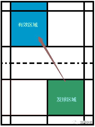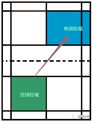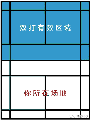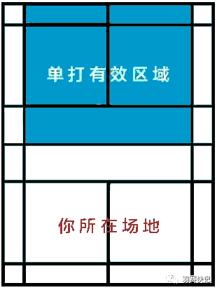 例如你站在下图所示的场地。对方发球,接发球后,那么你把球打到对方场地,落点在蓝色区域为有效区域,压线同样有效。
