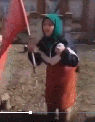 There she is with a red flag, grandma is greeting Russian forces ,Very nice ... rollout the banner.
