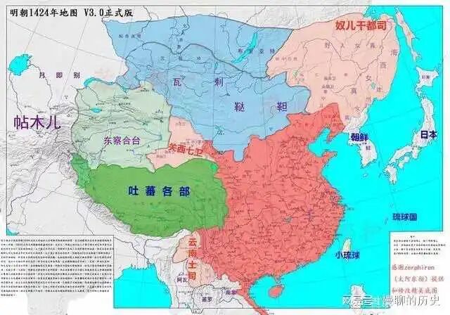 永乐时代是明朝的巅峰。这个时代,明朝在东北建立了奴儿干都司,在越南设立了交趾布政使司,并且设立了贵州省,推动了云贵高原的改土归流。这个时代,明朝的势力范围得到了扩大,西到哈密一带,南到东南亚。但是明朝始终没有对吐蕃、蒙古、西域建立统治,明朝的疆域面积这个时代大约是700万平方公里。