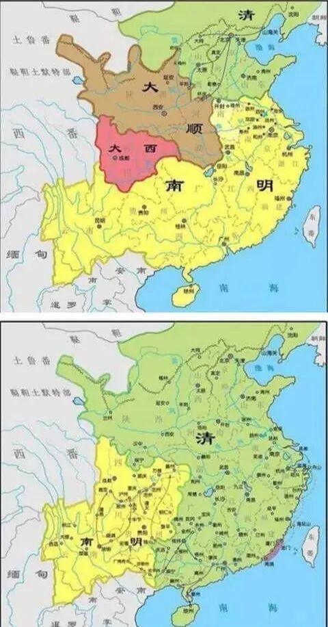 1644年,李自成灭了明朝。此后在南方出现了弘光、隆武、永历等南明政权,北方有李自成的“大顺”,四川有张献忠的”大西“,如此军阀割据,十分危险。他们相互征战,展开了远交近攻的游戏。而俄罗斯已经占据了更多的蒙古地区。
