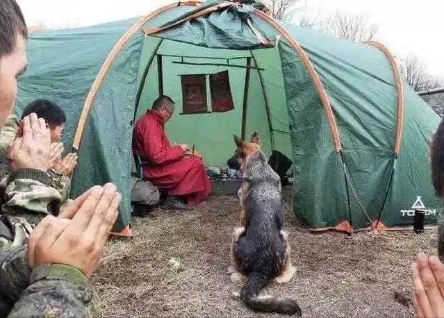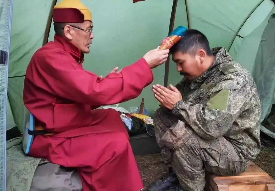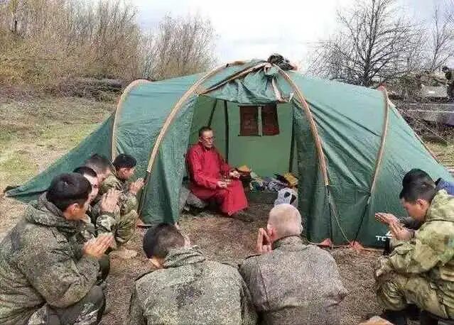 对,你没看错,这些东亚面孔,双手合掌,跟着喇嘛一起虔诚念经的,就是俄乌战争前线的俄罗斯官兵。