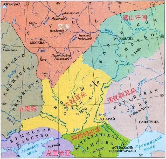在土尔扈特西迁之前,伏尔加流域也曾经几经变故。在公元15世纪后半叶,金帐汗国陷入军阀混战的局面。在公元1466年,在里海周边的伏尔加河流域产生了一个名为阿斯特拉罕汗国的割据政权,这个政权的统治者自称是成吉思汗的长子术赤第13个儿子脱花贴木儿的后代。在公元1502年金帐汗国彻底灭亡后,阿斯特拉罕汗这个政权完全独立。在公元1550年代,同样在金帐汗国崩溃后自立的莫斯科大公国扩张到了伏尔加河流域,阿斯特拉罕先是向其称臣,后来又改换阵营,转投了另外两个同样出自金帐汗国的鞑靼人势力,也就是克里米亚汗国和诺盖汗国。