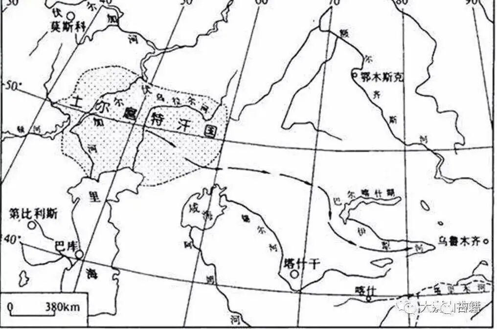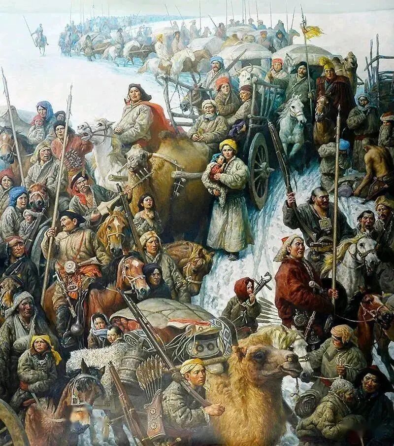 之后,两件历史事件的发生促进土尔扈特部的东归。一件是1657年沙俄废除一直以来都是沙俄附庸国的哥萨克盖特曼国,占领了该国控制的乌克兰大片领土,自此哥萨克盖特曼国不复存在;另一件是1757年准噶尔汗国不敌清朝,大败而覆灭。前者让当时土尔扈特部的首领起了戒心,而后者让土尔扈特部首领动了东归之心,就这样一前一后的推动下,终于在1771年土尔扈特部开始了东归之旅。不过,由于当时的土尔扈特部太过于庞大,而且加上东归消息很快泄露,于是伏尔加河西岸的土尔扈特部未能与东岸的土尔扈特部一同东归,而是永久地留在的欧洲……………………