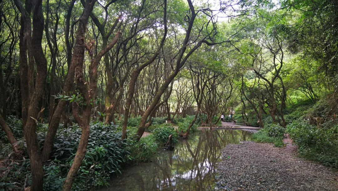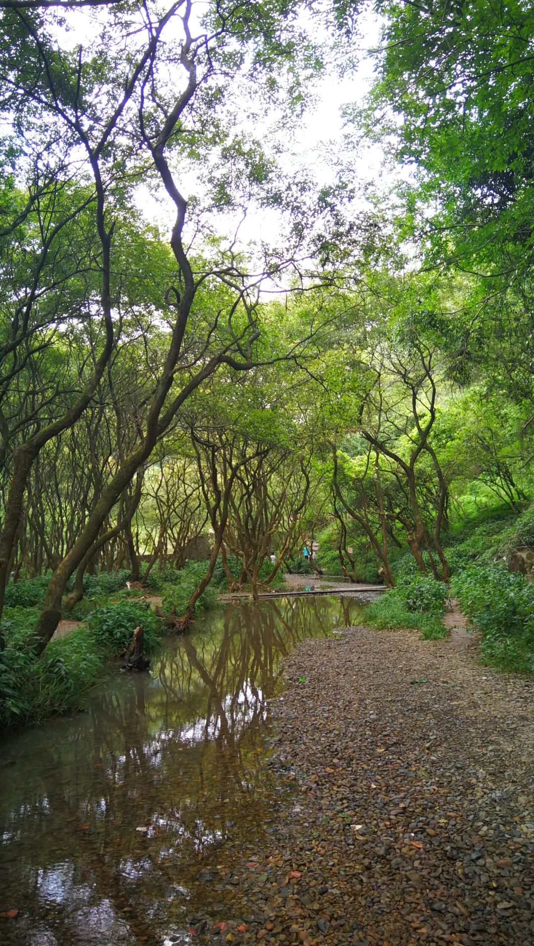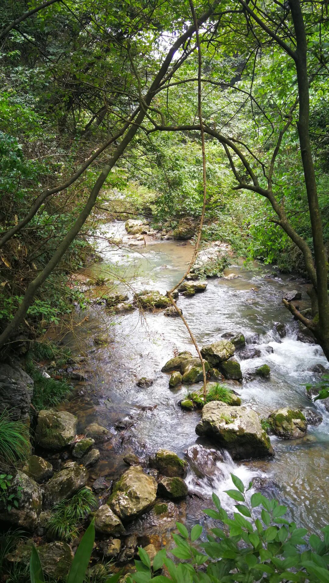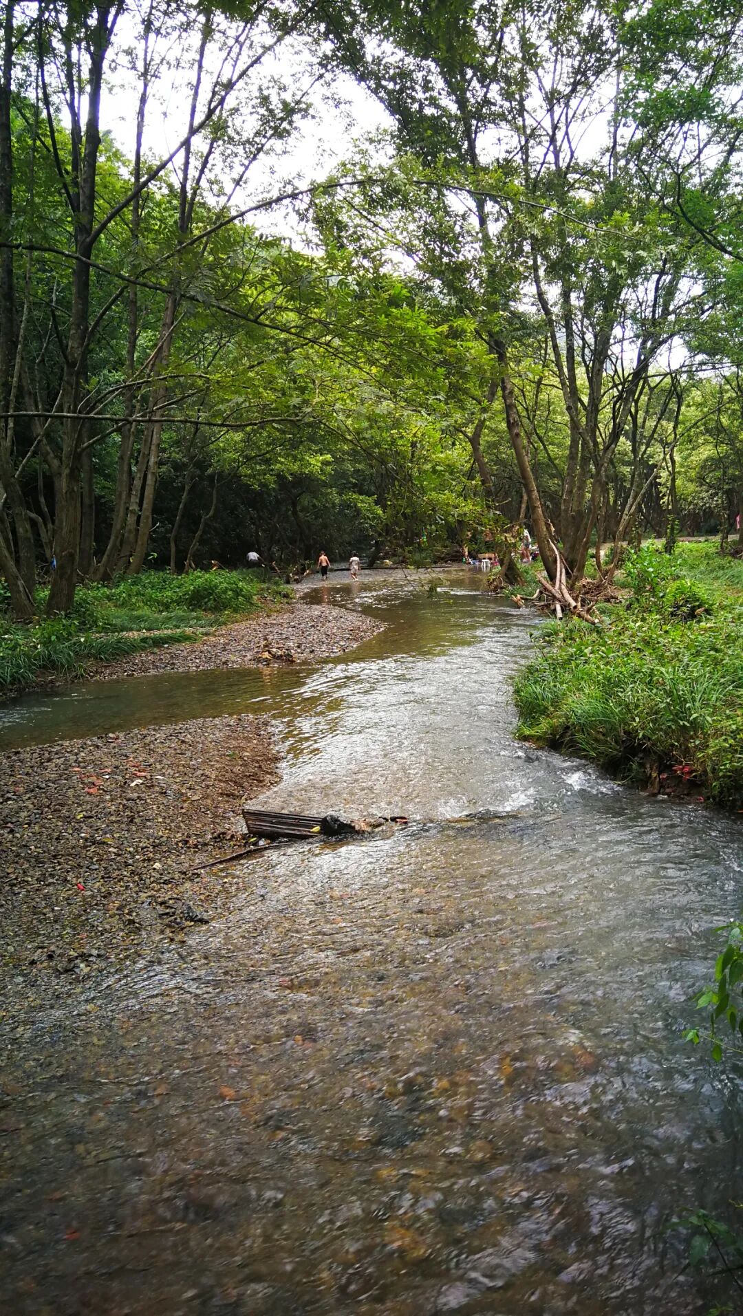 稍稍往里面行进一段,就能看到平坦的、毫无攻击性的、天然舒适的小溪流,鹅卵石静静的躺在里面,还有好多不知名的绿叶树矗立其间,烈日根本照不进来。