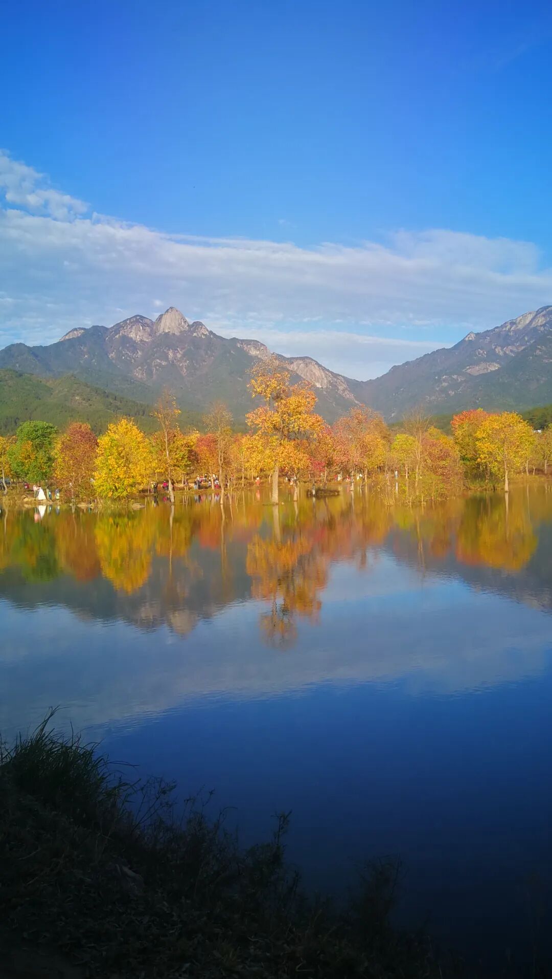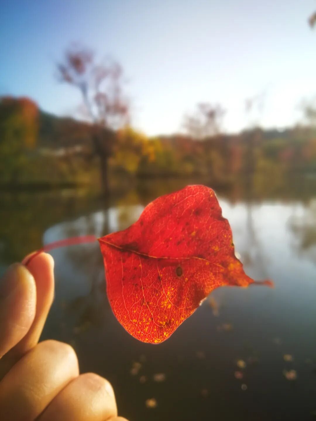 远处高山巍峨,眼前水波如镜,倒影红叶星火。阳光正好,树叶变成了最大的主角。