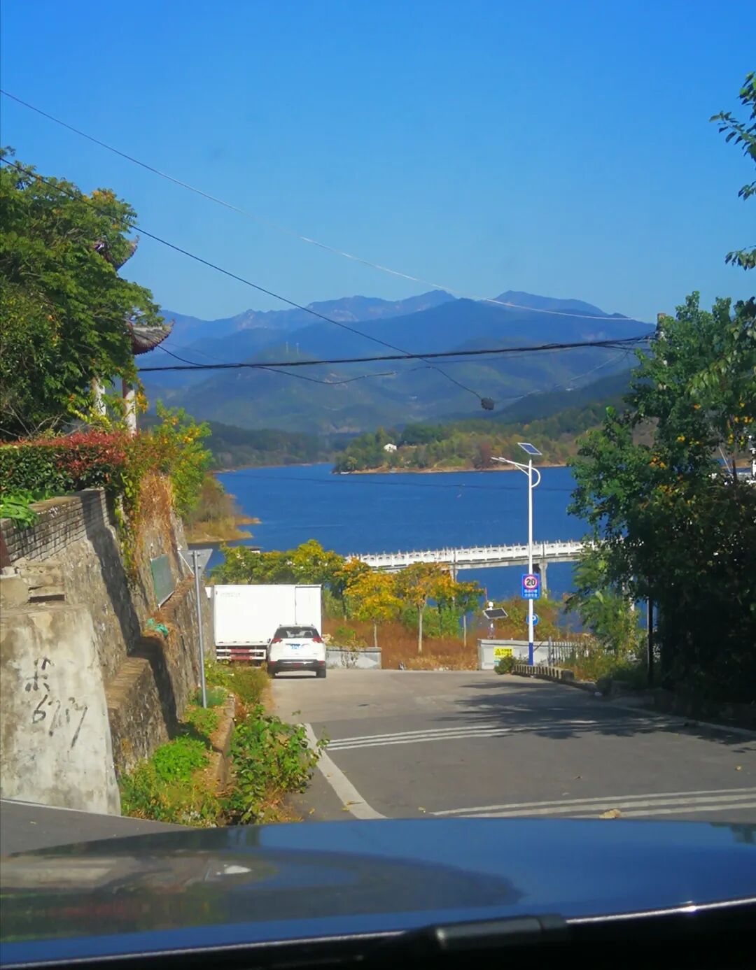 那汪蓝色湖泊,好像是途中的白庙河镇边上的一处水库。有观景台,值得下来拍照打卡。
