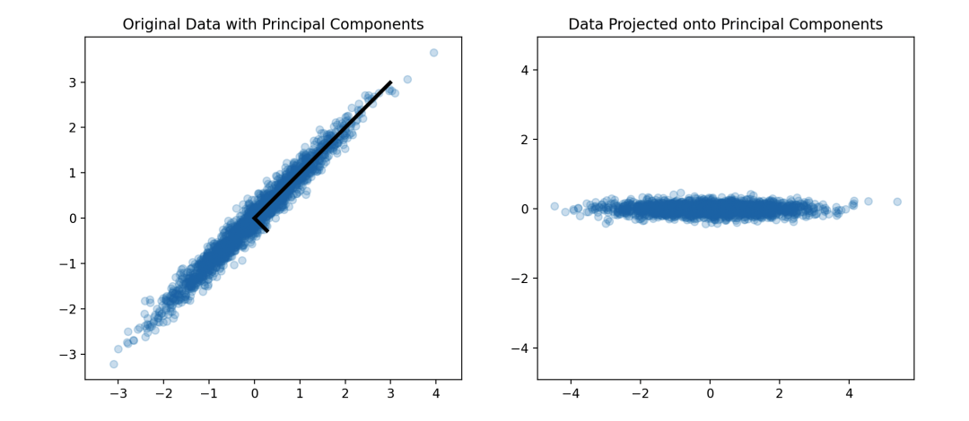 import numpy as npimport matplotlib.pyplot as pltfrom sklearn.decomposition import PCAfrom sklearn.preprocessing import StandardScaler# 1. 生成二维数据np.random.seed(0)X = np.dot(np.random.rand(2, 2), np.random.randn(2, 2000)).T# 2. 标准化数据scaler = StandardScaler()X_std = scaler.fit_transform(X)# 3. 计算PCApca = PCA(n_components=2)X_pca = pca.fit_transform(X_std)# 4. 绘制原理图def plot_pca(X, X_pca, pca): fig, ax = plt.subplots(1, 2, figsize=(12, 5)) # 原始数据和主成分方向 ax[0].scatter(X[:, 0], X[:, 1], alpha=0.2) for length, vector in zip(pca.explained_variance_, pca.components_): v = vector * 3 * np.sqrt(length) ax[0].plot([0, v[0]], [0, v[1]], '-k', lw=3) ax[0].set_title('Original Data with Principal Components') ax[0].axis('equal') # 投影后的数据 ax[1].scatter(X_pca[:, 0], X_pca[:, 1], alpha=0.2) ax[1].set_title('Data Projected onto Principal Components') ax[1].axis('equal') plt.show()plot_pca(X_std, X_pca, pca)