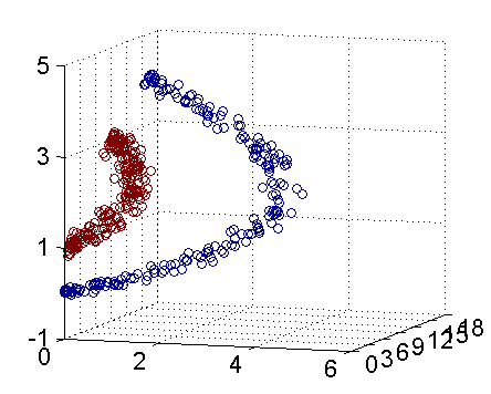 当我们使用映射函数把这两个类似于椭圆形的点映射到三维空间后,对映射后的坐标加以旋转之后就可以得到一个线性可分的点集如下图。