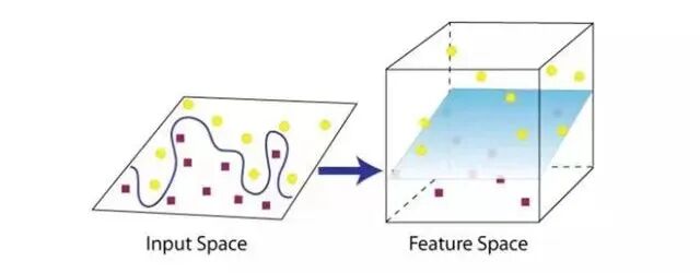 对于这样的问题,一种解决方案是将样本从原始空间映射到一个更高维的特征空间,使得样本在这个特征空间内线性可分,然后再运用 SVM 求解,如下图所示: