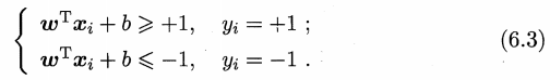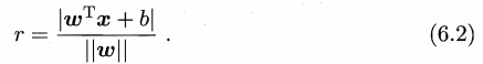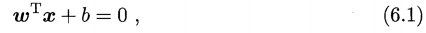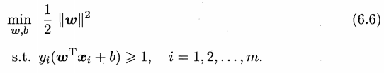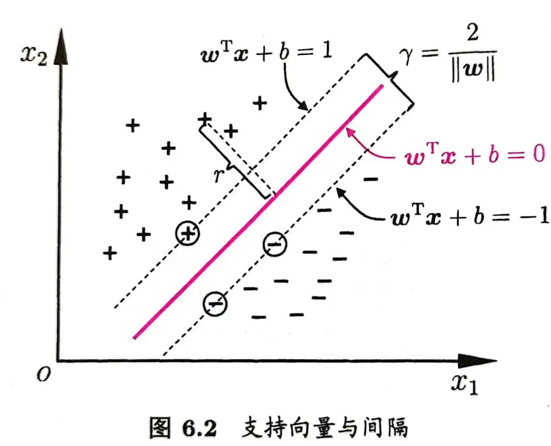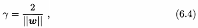 如图6.2所示,距离超平面最近的这几个训练样本点使式(6.3)的等号成立,它们被称为“支持向量”,两个异类支持向量到超平面的距离之和为(6.4),被成为间隔。