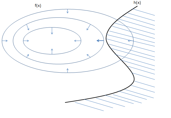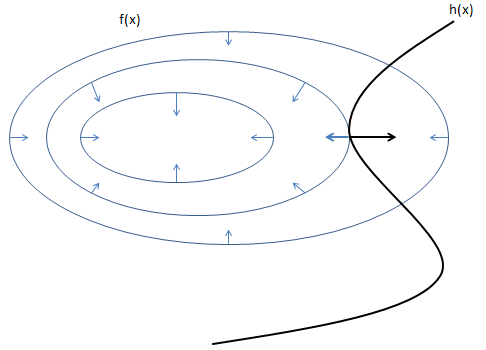 刚刚碗的最底部已经不满足现在这个约束条件了。f(x)与h(x)相切的地方,也许才是符合我们条件的最优值。