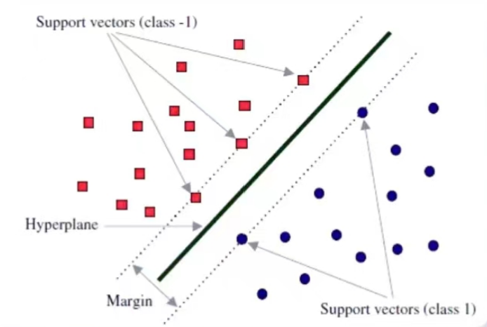 支持向量:离分类超平面 (Hyperplane) 最近的样本点。(虚线上的点)