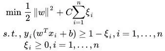 我们在原模型上加入一个正则项,正则项由惩罚系数C和松弛变量组成。其中,惩罚系数C是一个超参数,是由我们自己设置的,并且带上限制条件。