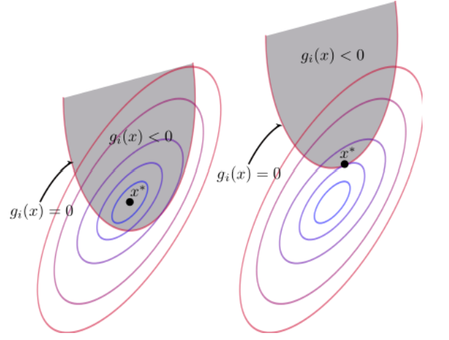 对于不等式约束有两种情况,一种是极值点在可行域内部,一种是极值点仍然在与等值线相切的地方(而这种就和等式约束的情况是一致的)。