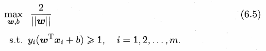 欲找到具有“最大间隔”的划分超平面,也就是要找到能够满足式(6.3)中约束的参数w和b,使得间隔最大,即