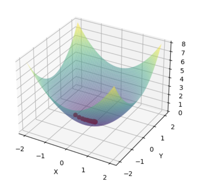 运行上述代码,将会绘制一个三维图像。其中,曲面表示函数f(x, y) = x^2 + y^2,红色的点表示随机梯度下降路径。
