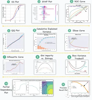 这些图表涉及了数据分析和机器学习领域中常用的可视化工具和概念,这些工具和概念有助于评估和解释模型性能、理解数据分布、选择最佳参数和模型复杂性,以及洞察特征对预测的影响。