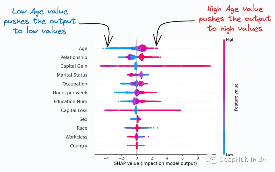 SHAP Plot通过考虑特征之间的相互作用/依赖关系来总结特征对模型预测的重要性。在确定一个特征的不同值(低或高)如何影响总体输出时很有用。