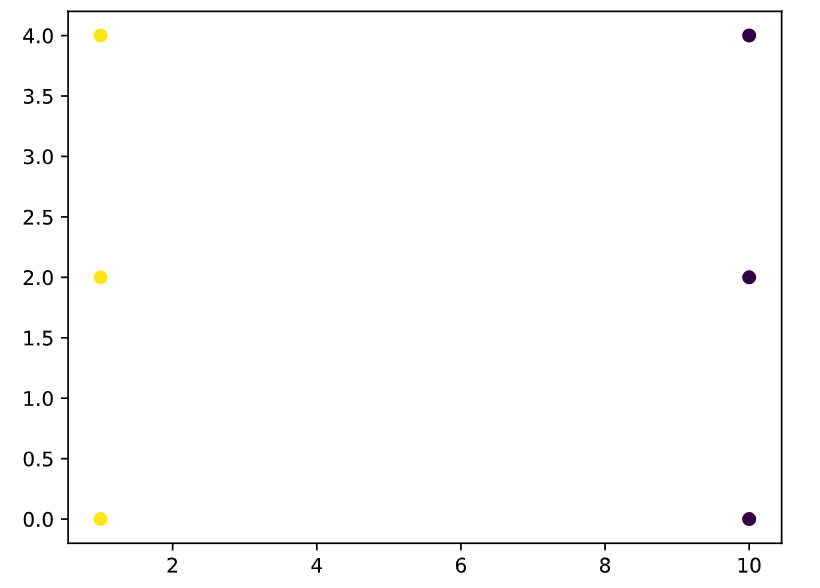 from sklearn.cluster import KMeansimport matplotlib.pyplot as pltimport numpy as np# 创建数据X = np.array([[1, 2], [1, 4], [1, 0], [10, 2], [10, 4], [10, 0]])# 训练模型kmeans = KMeans(n_clusters=2)kmeans.fit(X)# 获取簇标签y_kmeans = kmeans.predict(X)# 绘图plt.scatter(X[:, 0], X[:, 1], c=y_kmeans)plt.show()
