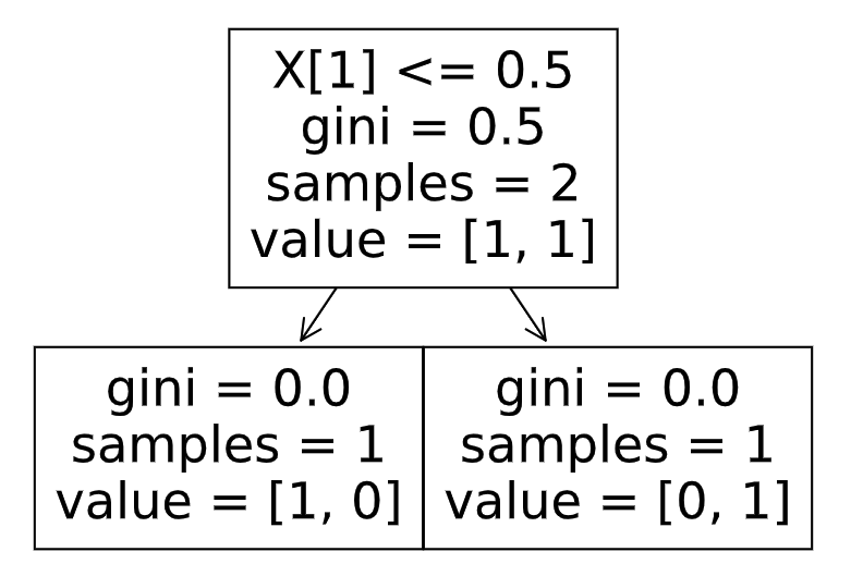 from sklearn.tree import DecisionTreeClassifierfrom sklearn import treeimport matplotlib.pyplot as plt# 创建数据X = [[0, 0], [1, 1]]y = [0, 1]# 训练模型clf = DecisionTreeClassifier()clf.fit(X, y)# 绘制决策树tree.plot_tree(clf)plt.show()