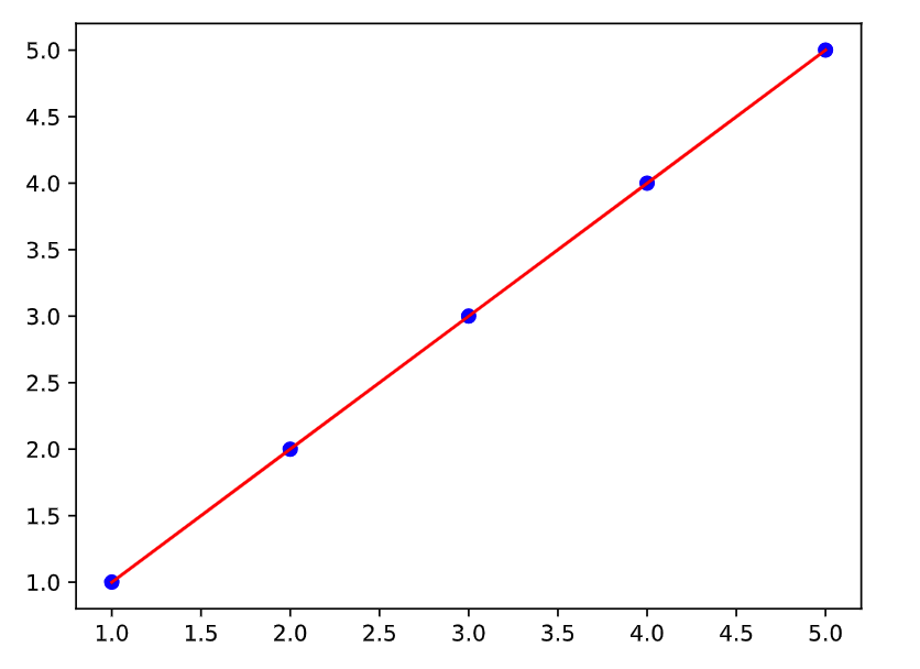 from sklearn.linear_model import LinearRegressionimport numpy as npimport matplotlib.pyplot as plt# 创建数据X = np.array([[1], [2], [3], [4], [5]])y = np.array([1, 2, 3, 4, 5])# 训练模型model = LinearRegression()model.fit(X, y)# 预测y_pred = model.predict(X)# 绘图plt.scatter(X, y, color='blue')plt.plot(X, y_pred, color='red')plt.show()