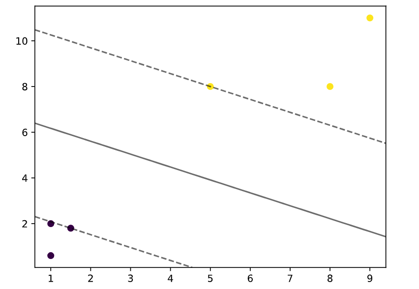 from sklearn.svm import SVCimport matplotlib.pyplot as pltimport numpy as np# 创建数据X = np.array([[1, 2], [5, 8], [1.5, 1.8], [8, 8], [1, 0.6], [9, 11]])y = [0, 1, 0, 1, 0, 1]# 训练模型clf = SVC(kernel='linear')clf.fit(X, y)# 绘制数据点和决策边界plt.scatter(X[:, 0], X[:, 1], c=y)ax = plt.gca()xlim = ax.get_xlim()ylim = ax.get_ylim()# 创建网格xx, yy = np.meshgrid(np.linspace(xlim[0], xlim[1], 50), np.linspace(ylim[0], ylim[1], 50))Z = clf.decision_function(np.c_[xx.ravel(), yy.ravel()])Z = Z.reshape(xx.shape)# 绘制决策边界ax.contour(xx, yy, Z, colors='k', levels=[-1, 0, 1], alpha=0.5,linestyles=['--', '-', '--'])plt.show()