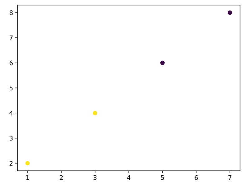 from sklearn.naive_bayes import GaussianNBimport numpy as npimport matplotlib.pyplot as plt# 创建数据X = np.array([[1, 2], [3, 4], [5, 6], [7, 8]])y = np.array([1, 1, 0, 0])# 训练模型model = GaussianNB()model.fit(X, y)# 预测y_pred = model.predict(X)# 绘图plt.scatter(X[:, 0], X[:, 1], c=y_pred)plt.show()