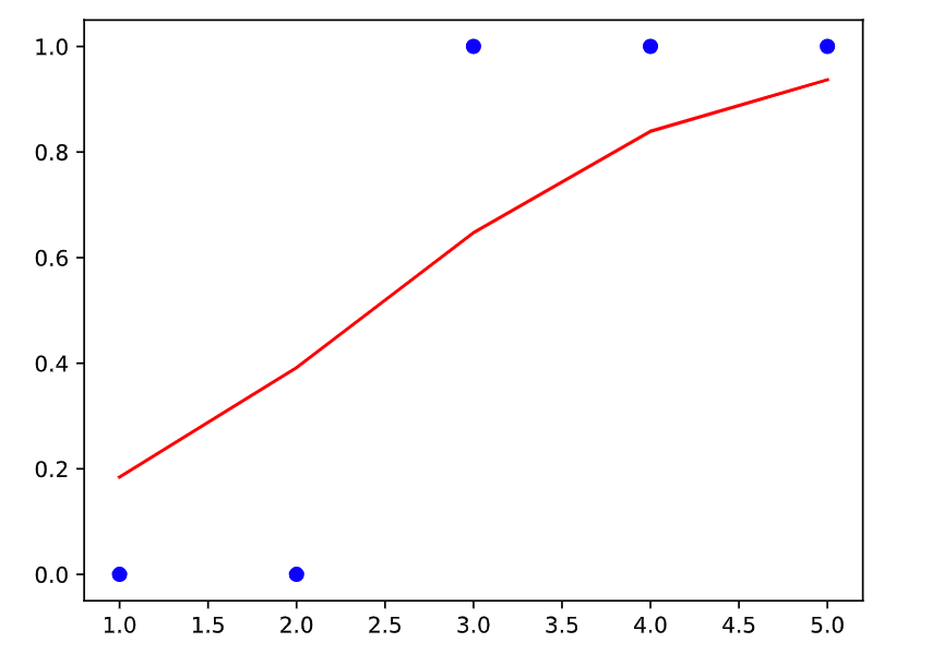 from sklearn.linear_model import LogisticRegressionimport numpy as npimport matplotlib.pyplot as plt# 创建数据X = np.array([[1], [2], [3], [4], [5]])y = np.array([0, 0, 1, 1, 1])# 训练模型model = LogisticRegression()model.fit(X, y)# 预测y_pred = model.predict_proba(X)[:, 1]# 绘图plt.scatter(X, y, color='blue')plt.plot(X, y_pred, color='red')plt.show()