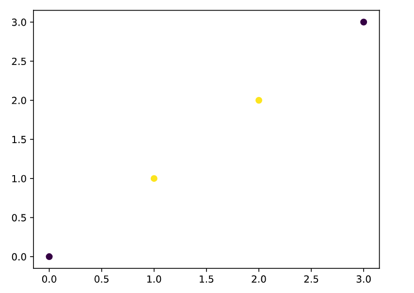 from sklearn.ensemble import RandomForestClassifierimport matplotlib.pyplot as pltimport numpy as np# 创建数据X = [[0, 0], [1, 1], [2, 2], [3, 3]]y = [0, 1, 1, 0]# 训练模型clf = RandomForestClassifier(n_estimators=10)clf.fit(X, y)# 预测y_pred = clf.predict(X)# 绘图plt.scatter(np.array(X)[:, 0], np.array(X)[:, 1], c=y_pred)plt.show()