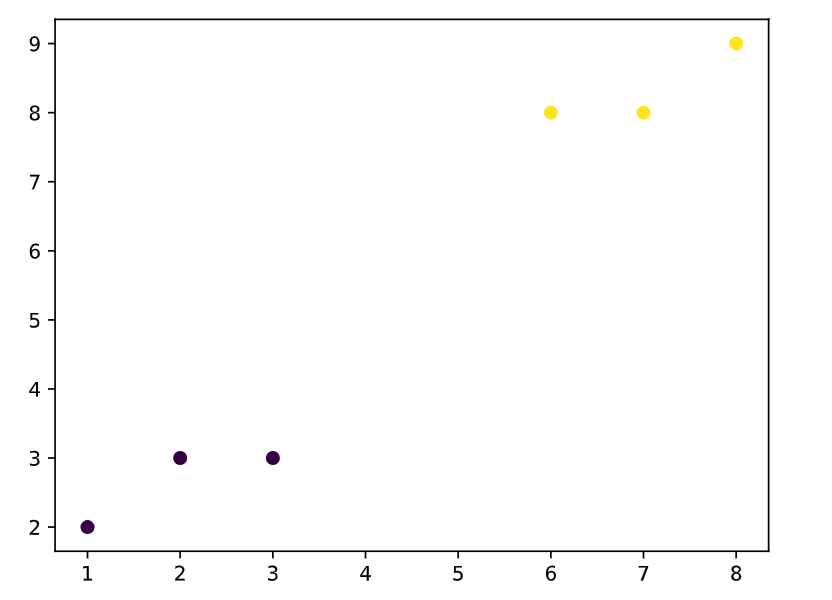 from sklearn.neighbors import KNeighborsClassifierimport matplotlib.pyplot as pltimport numpy as np# 创建数据X = np.array([[1, 2], [2, 3], [3, 3], [6, 8], [7, 8], [8, 9]])y = [0, 0, 0, 1, 1, 1]# 训练模型knn = KNeighborsClassifier(n_neighbors=3)knn.fit(X, y)# 绘图plt.scatter(X[:, 0], X[:, 1], c=y)plt.show()
