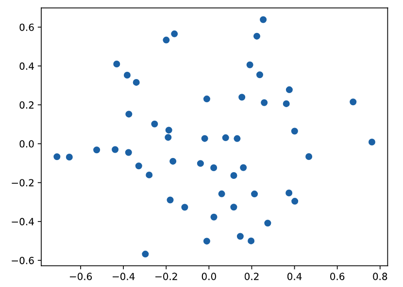 from sklearn.decomposition import PCAimport matplotlib.pyplot as pltimport numpy as np# 创建数据X = np.random.rand(50, 3)# 训练模型pca = PCA(n_components=2)X_r = pca.fit_transform(X)# 绘图plt.scatter(X_r[:, 0], X_r[:, 1])plt.show()