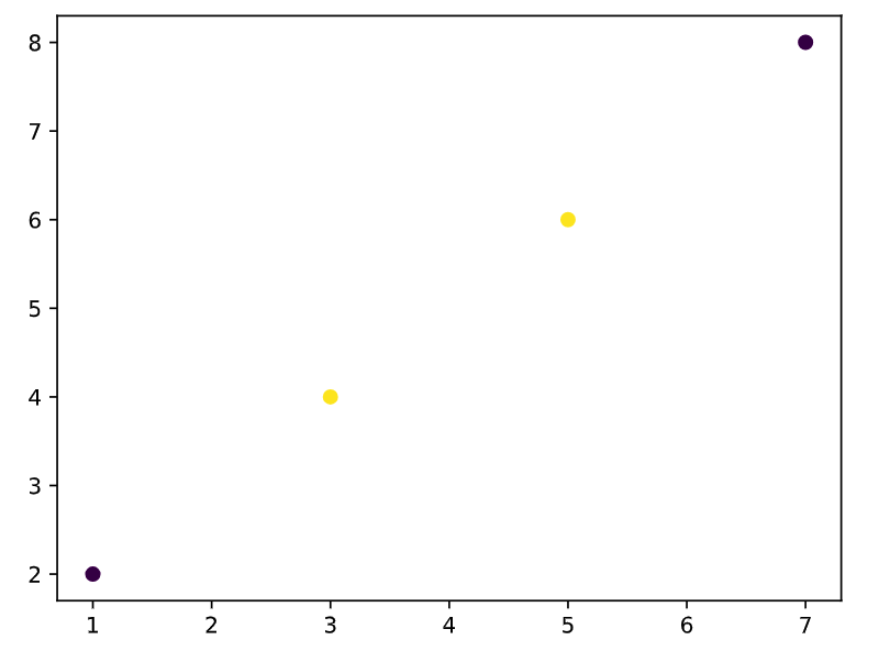 from sklearn.ensemble import GradientBoostingClassifierimport numpy as npimport matplotlib.pyplot as plt# 创建数据X = np.array([[1, 2], [3, 4], [5, 6], [7, 8]])y = np.array([0, 1, 1, 0])# 训练模型clf = GradientBoostingClassifier()clf.fit(X, y)# 预测y_pred = clf.predict(X)# 绘图plt.scatter(X[:, 0], X[:, 1], c=y_pred)plt.show()