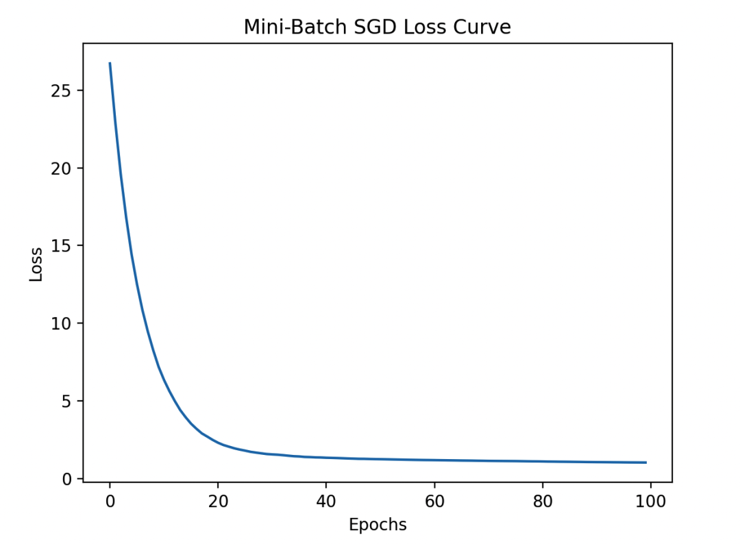 import numpy as npimport matplotlib.pyplot as pltdef mini_batch_sgd(X, Y, theta, learning_rate=0.01, epochs=100, batch_size=32): m = len(Y) losses = [] for epoch in range(epochs): # 打乱数据 permutation = np.random.permutation(m) X_shuffled = X[permutation] Y_shuffled = Y[permutation] for i in range(0, m, batch_size): X_mini_batch = X_shuffled[i:i+batch_size] Y_mini_batch = Y_shuffled[i:i+batch_size] # 计算梯度 gradient = compute_gradient(X_mini_batch, Y_mini_batch, theta) # 更新参数 theta = theta - learning_rate * gradient # 计算整个数据集的损失 loss = compute_loss(X, Y, theta) losses.append(loss) return theta, lossesdef compute_gradient(X, Y, theta): # 使用mini-batch计算梯度 # 具体问题和损失函数决定了这里的实现 # 为了简化,假设一个简单的线性回归问题 gradient = np.dot(X.T, (np.dot(X, theta) - Y)) / len(Y) return gradientdef compute_loss(X, Y, theta): # 使用整个数据集计算损失 # 具体问题和损失函数决定了这里的实现 # 为了简化,假设一个简单的线性回归问题 loss = np.mean((np.dot(X, theta) - Y)**2) return loss# 生成简单线性回归问题的合成数据np.random.seed(42)X = 2 * np.random.rand(100, 1)Y = 4 + 3 * X + np.random.randn(100, 1)# 初始化参数theta_initial = np.random.randn(2, 1)# 执行Mini-Batch SGDtheta_final, losses = mini_batch_sgd(np.c_[np.ones((100, 1)), X], Y, theta_initial)# 绘制损失曲线plt.plot(losses)plt.xlabel('Epochs')plt.ylabel('Loss')plt.title('Mini-Batch SGD Loss Curve')plt.show()