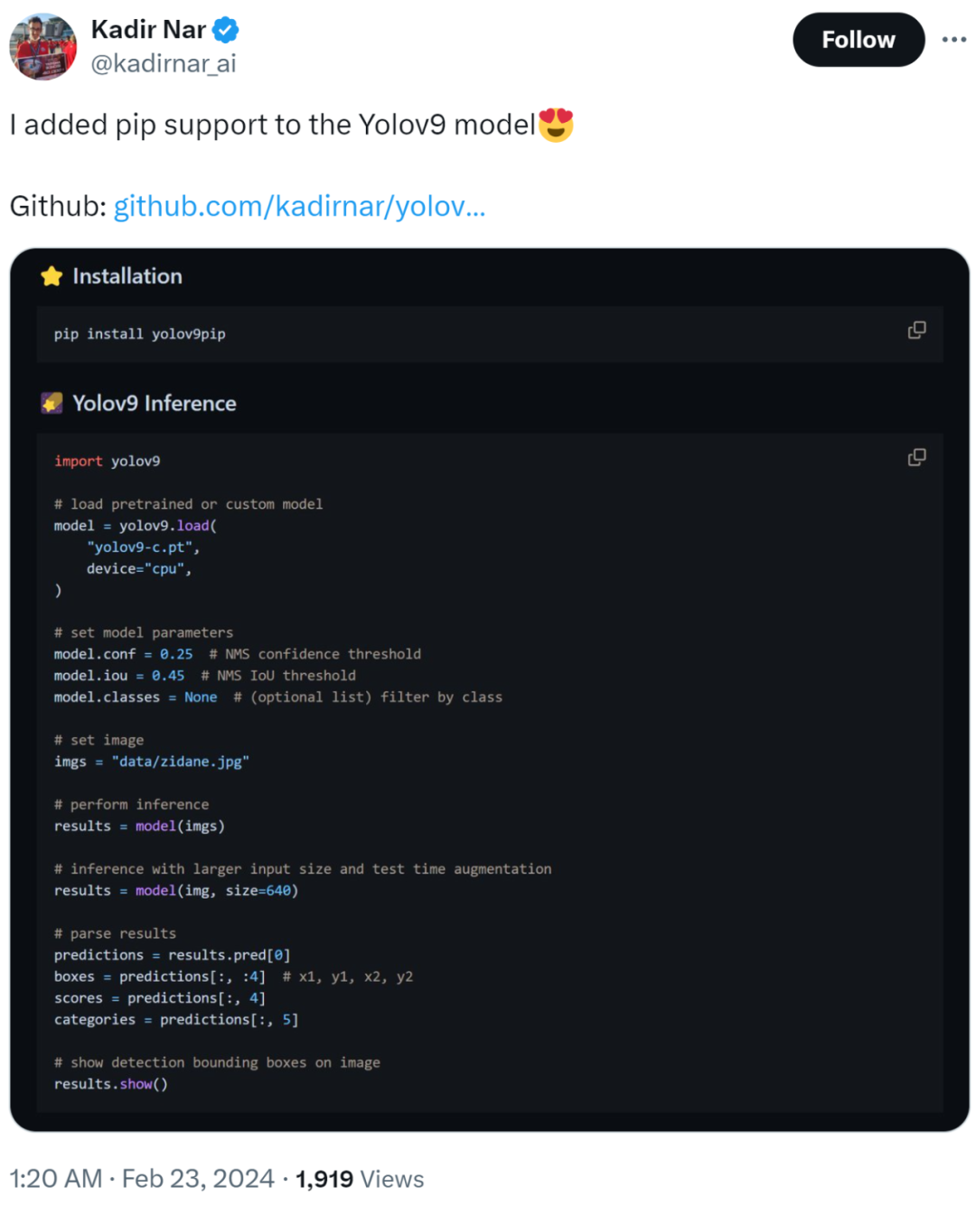 更有「勤劳」的网友已经为 YOLOv9 模型添加了 pip 支持。