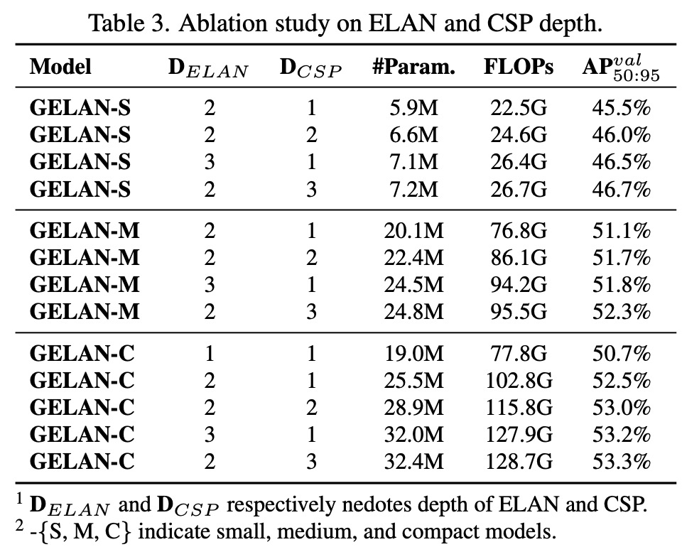 然后该研究又在不同尺寸的 GELAN 上针对 ELAN 块深度和 CSP 块深度进行了消融实验,结果如下表 3 所示。