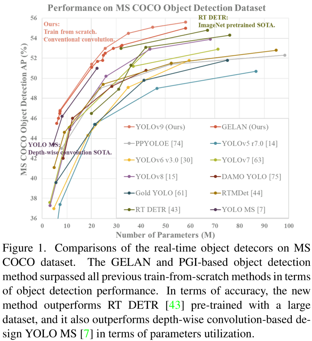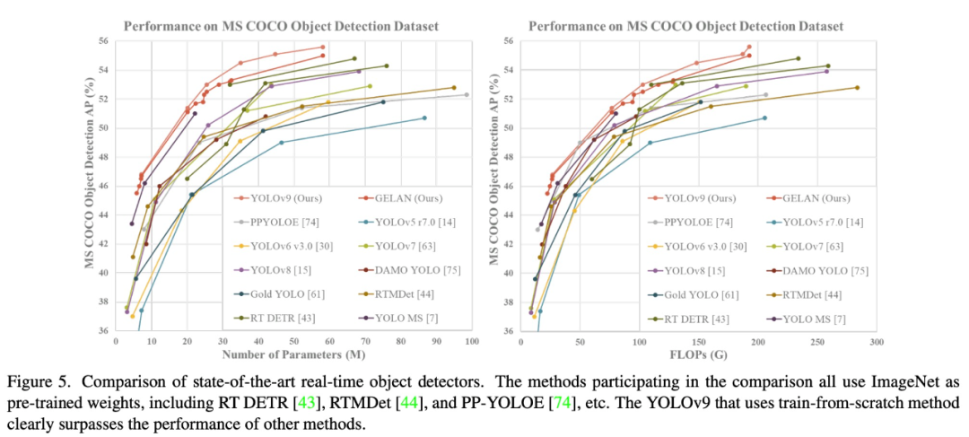 该研究还将 ImageNet 预训练模型纳入比较中,结果如下图 5 所示。值得注意的是,使用传统卷积的 YOLOv9 在参数利用率上甚至比使用深度卷积的 YOLO MS 还要好。