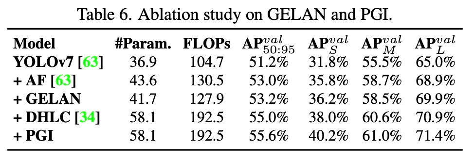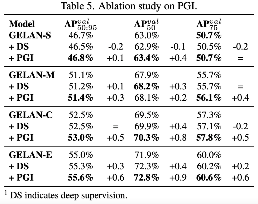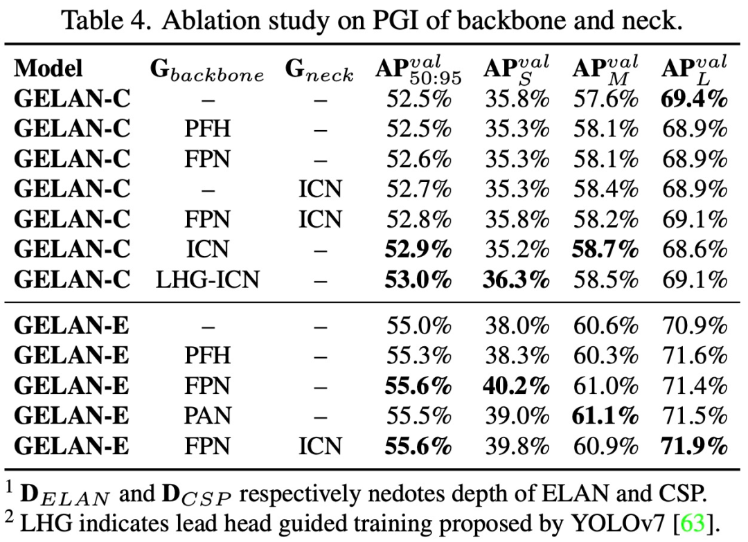 在 PGI 方面,研究者分别在主干网络和 neck 上对辅助可逆分支和多级辅助信息进行了消融研究。表 4 列出了所有实验的结果。从表 4 中可以看出,PFH 只对深度模型有效,而本文提出的 PGI 在不同组合下都能提高精度。