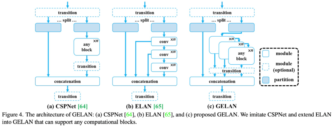此外,该研究还提出了一个新的网络架构 GELAN(如下图所示),具体而言,研究者把 CSPNet、 ELAN 这两种神经网络架构结合起来,从而设计出兼顾轻量级、推理速度和准确性的通用高效层聚合网络(generalized efficient layer aggregation network ,GELAN)。研究者将最初仅使用卷积层堆叠的 ELAN 的功能泛化到可以使用任何计算块的新架构。