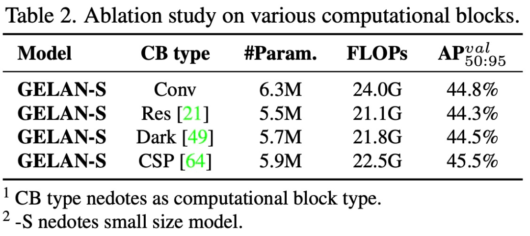 该研究首先对 GELAN 的计算块进行消融实验。如下表 2 所示,该研究发现用不同的计算块替换 ELAN 中的卷积层后,系统可以保持良好的性能。