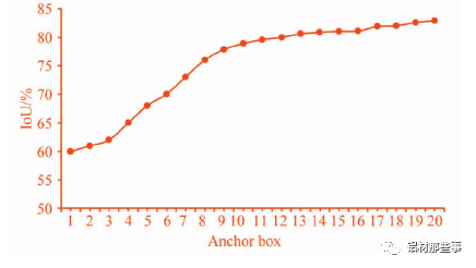 式中: Io Utruthpted为交并比,area( boxpred∩boxtruth表示预测目标框和真实目标框的交集部分面积,area( boxpred∪boxtruth表示预测目标框和真实目标框的并集部分面积。本文设定 K-means 聚类分析中簇的个数 K =1,2,…,20,聚类分析结果如图 5 所示。可以看出,随着 K 个数的增加,Io U 的数值不断增加,增长率不断减小。一般来说,最佳 K 值选取点为曲线斜率最大点之后的点。一方面,较少数量的 K值可以减少模型计算量,进一步加快损失函数的收敛。另一方面,也可以去除由较多目标框带来的识别误差。从图中可以看出,K =9 时为最优点,其对应的目标框分别为( 25,33) ,( 26,101) ,( 50,555) ,( 62,235) ,( 80,587) ,( 90,37) ,( 133,325) ,( 257,86) ,( 554,58) 。