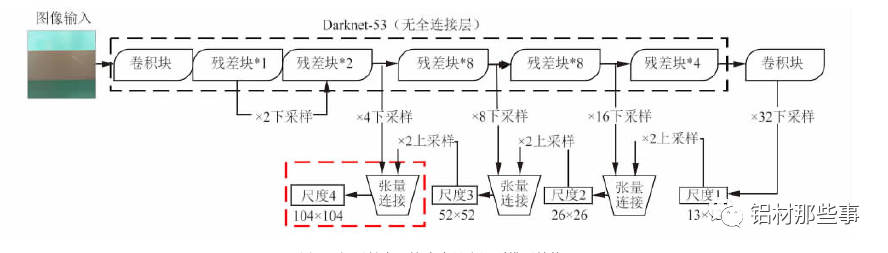 以此类推,该尺度特征图再次通过 2 倍上采样,与 8 倍下采样生成的 52 × 52 分辨率的特征图进行张量连接,生成同为 52 × 52 分辨率且 3 尺度融合的铝型材特征图( 尺度 3) 。在铝型材缺陷识别中,存在微小的缺陷区域,使用原YOLOv3 中多尺度预测的方法难以满足微小缺陷精确识别的需求。针对该问题,本文对 YOLOv3 模型进行改进,将原有 3个尺度识别扩展为 4 个尺度,增加 104 × 104 分辨率的特征图,见图 4 新加结构。该尺度通过张量连接的方式,将 4 倍下采样生成的 104 ×104 分辨率的特征图与尺度 3 中 52 × 52分辨率的特征图融合。通过多尺度特征融合方式,将不同分辨率的特征图融合后单独输出且分别进行目标预测,以此提升小目标识别的精确度。融合后的尺度 4 包含之前各尺度信息的特征图,可改善铝型材表面微小缺陷的识别效果。