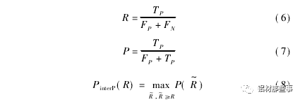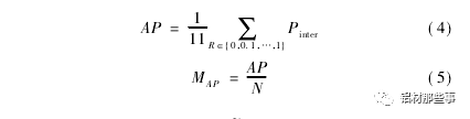 式中: PinterP( R) 为召回率满足 R~≥R 时的准确率的最大值,N为模型中待识别类别的个数。召回率表示正确识别的目标个数占总目标数百分比,准确率表示正确识别的目标个数占总识别目标个数百分比。召回率 R、准确率 P 和 PinterP( R) 可用公式表示为
