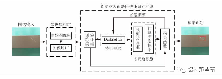 铝型材表面缺陷识别模型的工作流程如下: 首先,构建铝型材表面缺陷图像数据集,将缺陷图像输入识别模型进行训练; 再根据预测边界框及所属类别的概率对缺陷进行多尺度预测; 最后通过损失函数不断调整训练参数,以得到改进后识别模型的参数。