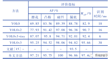 式中: TP为真正例,表示正样本被预测为正样本的数量; FP为假正例,表示负样本被预测为正样本的数量; FN为假负例,表示正样本被预测为负样本的数量; TN为真负例,表示负样本被预测为负样本的数量。为了定量分析本文方法实验效果,将本文方法与 YOLO、YOLOv2、YOLOv3、YOLOv3-tiny 及文献基于图像特征的传统机器视觉方法进行对比。表 3 所示为不同方法的实验结果。可以看出,采用 YOLO 系列原模型,对于擦花缺陷,仅YOLOv3 的 AP 值达 到 95. 25% ,其 他 方法的 AP 值 都 较 低,YOLO 的 AP 值则低于 70% 。在凸粉和漏底缺陷的测试结果中,本文方法的 AP 最高,分别达到 95. 75% 与 96. 86% 。碰凹缺陷因特征明显,其 AP 值在对比方法中都较高,尤其是本文方法 AP 达到 100% 。