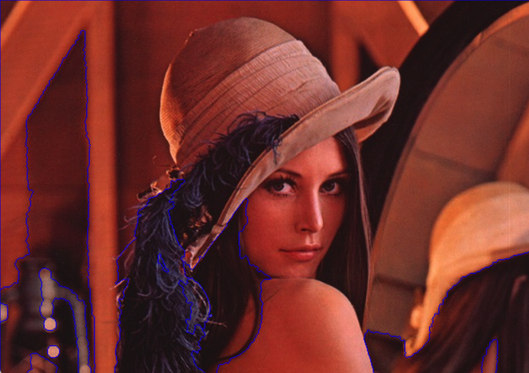 import cv2import numpy as np# 读取图像image = cv2.imread('lenna.jpg')gray = cv2.cvtColor(image, cv2.COLOR_BGR2GRAY)# 图像预处理_, thresh = cv2.threshold(gray, 0, 255, cv2.THRESH_BINARY_INV + cv2.THRESH_OTSU)# 形态学操作kernel = np.ones((3, 3), np.uint8)opening = cv2.morphologyEx(thresh, cv2.MORPH_OPEN, kernel, iterations=2)# 获取背景区域sure_bg = cv2.dilate(opening, kernel, iterations=3)# 获取前景区域dist_transform = cv2.distanceTransform(opening, cv2.DIST_L2, 5)_, sure_fg = cv2.threshold(dist_transform, 0.7 * dist_transform.max(), 255, 0)# 找到未知区域sure_fg = np.uint8(sure_fg)unknown = cv2.subtract(sure_bg, sure_fg)# 标记_, markers = cv2.connectedComponents(sure_fg)markers += 1markers[unknown == 255] = 0# 应用分水岭算法markers = cv2.watershed(image, markers)image[markers == -1] = [255, 0, 0] # 给分水岭线标记为红色# 显示结果cv2.imshow('Segmented Image', image)cv2.waitKey(0)cv2.destroyAllWindows()