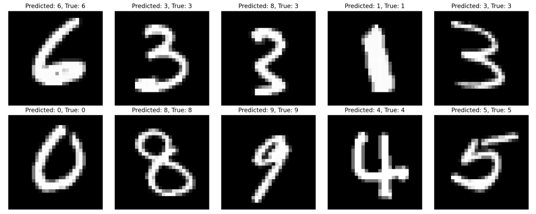 import numpy as npimport matplotlib.pyplot as plt# 选择一些测试图像num_images = 10random_indices = np.random.choice(test_images.shape[0], num_images, replace=False)sample_images = test_images[random_indices]sample_labels = test_labels[random_indices]# 对这些图像进行预测predictions = model.predict(sample_images)# 可视化预测结果plt.figure(figsize=(15, 6))for i in range(num_images): plt.subplot(2, 5, i + 1) plt.imshow(sample_images[i], cmap='gray') plt.title(f"Predicted: {np.argmax(predictions[i])}, True: {sample_labels[i]}") plt.axis('off')plt.tight_layout()plt.show()