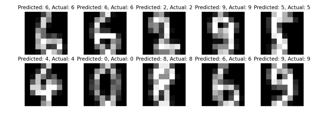import numpy as npfrom sklearn import datasetsfrom sklearn.model_selection import train_test_splitfrom sklearn.svm import SVCfrom sklearn.metrics import accuracy_score# 1. 加载数据集digits = datasets.load_digits()X = digits.datay = digits.target# 2. 数据预处理X = X / 255.0 # 归一化处理# 将数据集拆分为训练集和测试集X_train, X_test, y_train, y_test = train_test_split(X, y, test_size=0.2, random_state=42)# 3. 模型训练svm_model = SVC(kernel='linear', random_state=42)svm_model.fit(X_train, y_train)# 4. 模型评估y_pred = svm_model.predict(X_test)accuracy = accuracy_score(y_test, y_pred)print("Accuracy:", accuracy)# 绘制预测结果import matplotlib.pyplot as plt# 随机选择一些测试样本random_indices = np.random.choice(len(X_test), size=10, replace=False)# 绘制图像和预测结果plt.figure(figsize=(12, 4))for i, index in enumerate(random_indices): plt.subplot(2, 5, i + 1) plt.imshow(X_test[index].reshape(8, 8), cmap='gray') plt.title(f"Predicted: {y_pred[index]}, Actual: {y_test[index]}") plt.axis('off')plt.show()