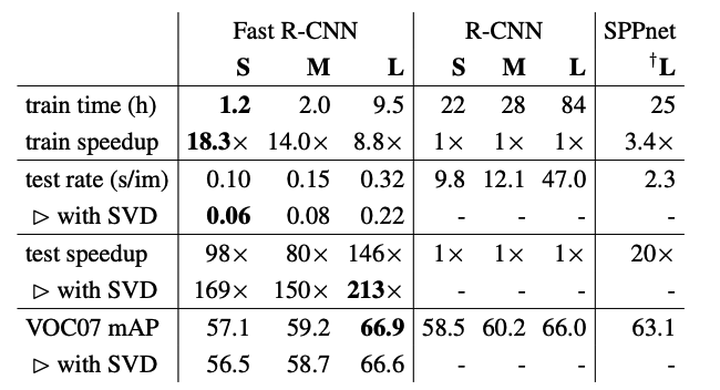 Fast R-CNN 在 PASCAL VOC 2012 数据集上取得了优异的性能,相比于 R-CNN 和 SPP-Net 方法,Fast R-CNN 显著提高了检测速度,并在 mAP 指标上取得了更好的结果。