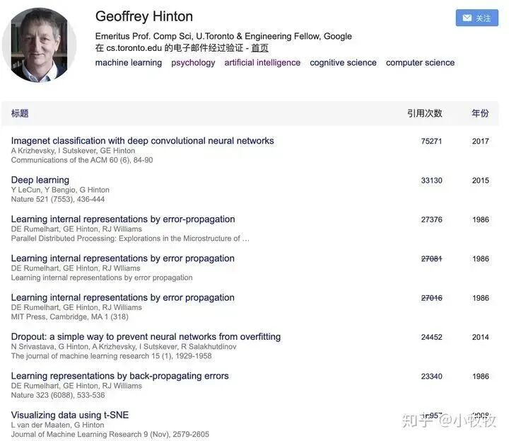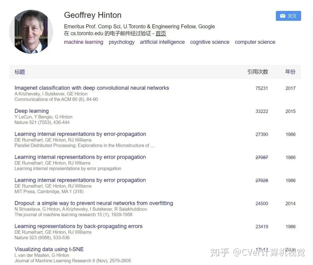 机器学习领域泰斗级学者Geoffrey Hinton的文章引用: