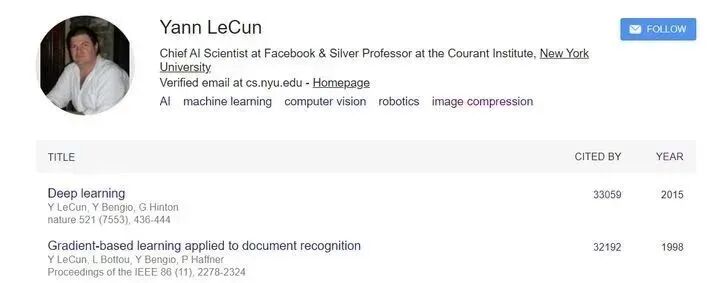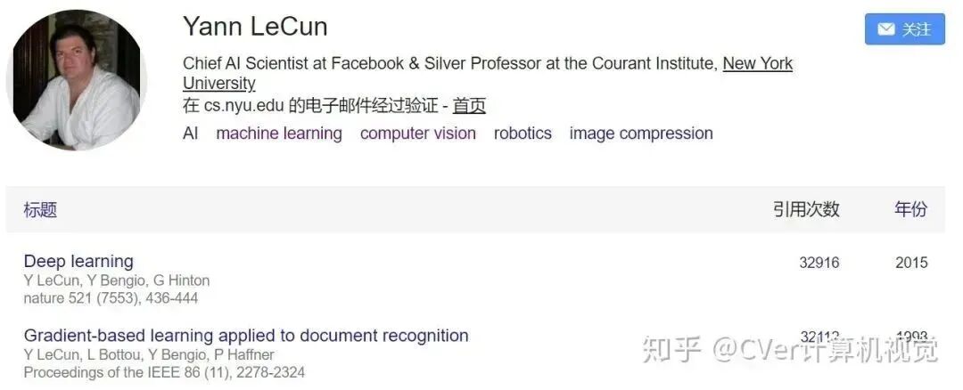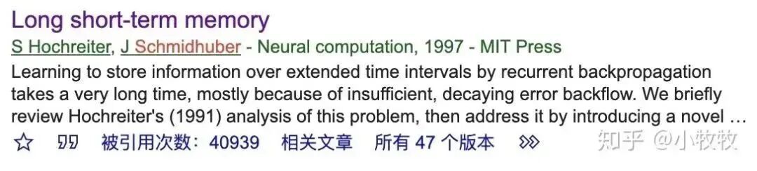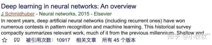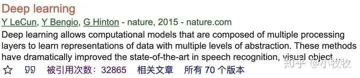 在机器学习领域还有一个泰斗级的人物Jürgen Schmidhuber,他的一篇文章Long short-term memory目前的引用量是40934次,是深度学习-循环神经网络(Recurrent Neural Network, RNN)中的重要成果。但是LeCun Y,Bengio Y和Hinton G在2015年发表在Nature上的文章Deep learning作者中没有Jürgen Schmidhuber,不过Schmidhuber在2015也发表了一篇关于深度学习的综述文章Deep learning in neural networks: An overview,目前的引用量是10917。后来,“三巨头“获得了2018年的“图灵奖”,Schmidhuber和“三巨头“在网络上因为“成果引用”和“成果认定”发生了大量的口水战,这些都是后话了。